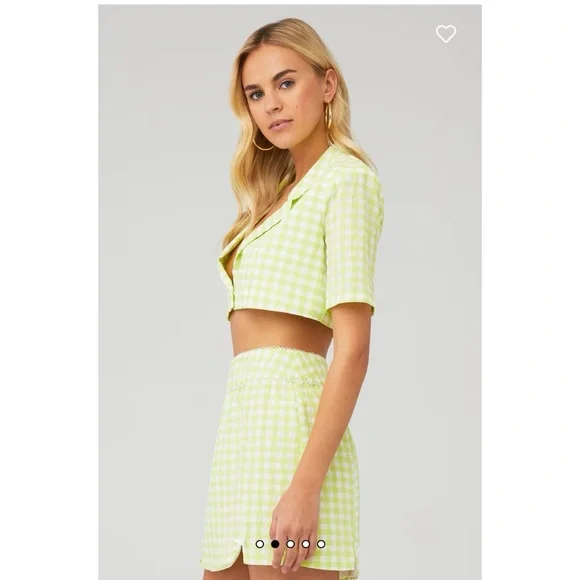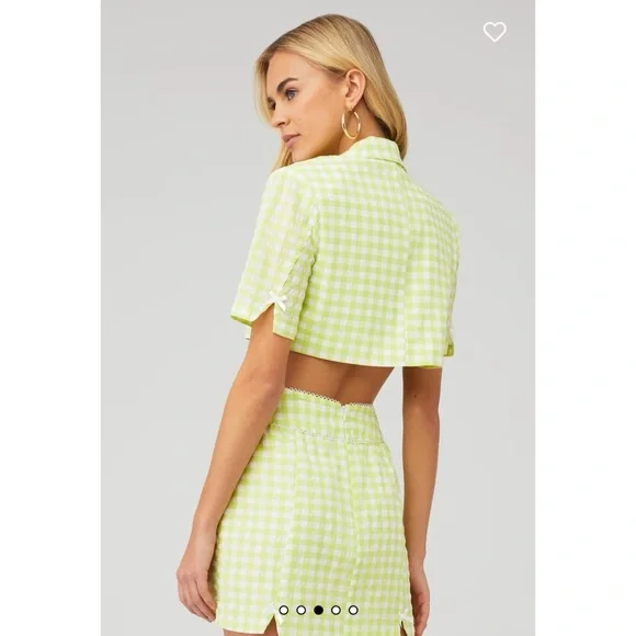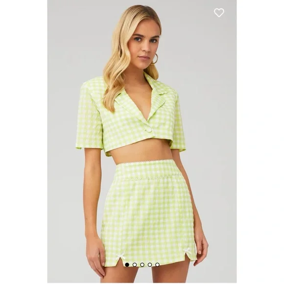 For Love & Lemons maureen, mini skirt is a summery textured gingham miniskirt featuring princess seem slits with delicate satin bows pair as well with the marine blazer top or the marine bra at top. Sold separately. Chic gingham checkered skirt in a vibrant green. Perfect for a stylish and fresh look.13” waist16” length