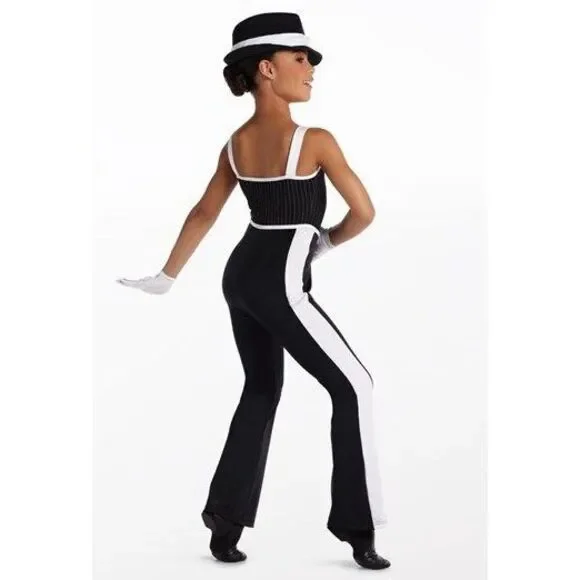 Weissman Style # 15726Colors: Black WhiteSize: Big Kid Large Child 12-14Great For:Jazz Tap Clogging Musical Theater Features: Rhinestones Lycra Solid Sleeveless Excellent condition. RHINESTONES have been added. DOES NOT Includes : Fedora, short gloves.New York New York15726Weissman ShowtimeJumpsuit with shiny spandex lapel, straps and trimPinstripe stretch suit bodice with jewel faux buttonsShiny spandex bottoms have contrast side stripeGlitter free!ImportedDOES NOT Includes : Fedora, short gloves.In Store # F24-613Payment:
